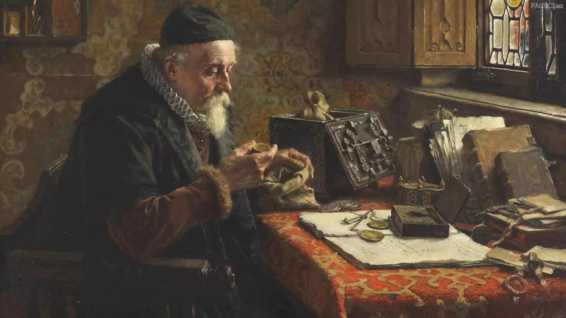 Mężczyzna, Okno, Worek, Malarstwo, Stół, Książki, Max Gaisser, Obraz, Monety - faceci.biz